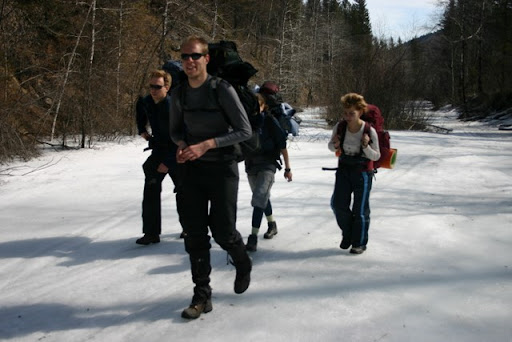 Po około 4h marszu decydujemy się zboczyć na wschód, wejść w las, no i góry. Pierwszy wybór okazuje się chybiony, po wspięciu się na niewielkie wzgórze wracamy i nadrabiamy jeszcze kawałek na północ. W polu spotykamy drogę, a przy niej przewróconą tabliczkę - Park Narodowy - zakaz polowania. To będzie to. W górę podążamy drogą, z każdym kilometrem coraz więcej śniegu. Zostawiamy ścieżynę i idziemy za kompasem. Tajga w najczystszej postaci. Pomału zaczynam tęsknić za drogą. Wkrótce na horyzoncie pojawia się przejaśnienie. Dziwne, bo do drugiego brzegu Bajkału jeszcze daleko. Podchodzimy bliżej… trudno opisać zdziwienie, które nas opanowało. Zobaczcie na zdjęcie: