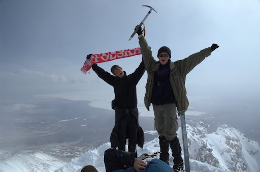 Krok za krokiem, posuwamy się jakby w miejscu. Jednak nie. Raki okazują się nieocenione, czekan też. W końcu grań i wyłaniający się niesamowity widok na stronę mongolską, jezioro Chubsuguł. Do szczytu jeszcze kilkadziesiąt metrów, ale już po czystej skale. W jednej ręce lina, w drugą czekan i przed siebie. Lepiej nie patrzeć w dół. Wejście asekurują ratownicy MCHS, sterujący dość natężonym ruchem - słusznie. 16.45 - upragniony szczyt. Widok zapiera dech w piersiach, euforia nieopisana. Zasięg w telefonie pozwala mi zadzwonić do domu. Zdobyty! Pierwszy lodowiec, pierwszy raz tak wysoko nie w samolocie. Triumfalne zdjęcia, mały posiłek, współdzielenie radości z innymi "zdobywcami" i po ponad 30min na szczycie pora w dół. Po linie do grani, potem po kamieniach… słyszę krzyk. Sekundę później rozpędzony do kilkudziesięciu km/h Wowa, przelatuje koło mnie koziołkując, bynajmniej nie kontrolowanie. Idący kilkanaście metrów przede mną ratownik rzuca by go zatrzymać. Zabrakło metra, dwóch. Wowa leci dalej w dół, wytracając jednak prędkość. Zatrzymuje się. Chwila niepewności. Wstaje. Jest żywy, cały. Dalej pojedziemy już na tyłkach, w przeciwieństwie do Wowy - kontrolowanie. Koszulka w gacie, polar ściągnięty do maksimum, pas śnieży zapięty, pod kurtkę aparat i jeszcze ściągacze. Czekan pod pachę, nogi w górę i…. JAZDA! Wrażenia lepsze, niż na torze saneczkowym, śnieg mam w każdym zakątku ciała, ale to nie odbiera radości. Szybko lądujemy nad jeziorem. Dalszy odcinek to również freestyle - naprzemienny dupozjazd kontrolowany czekanem i mimowolne zsuwanie się na nogach. Koło 21 meldujemy się w obozie. Satysfakcja ogromna. Zmęczenie jeszcze większe.